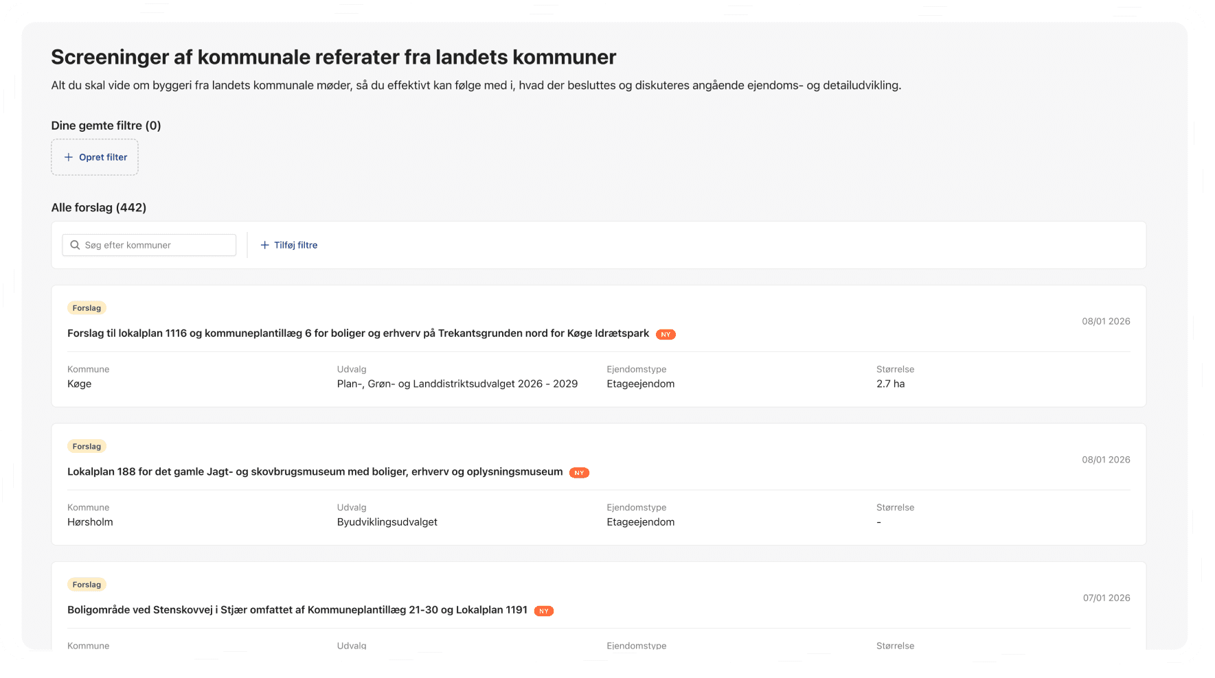 Gennem AI-screening af kommunale beslutninger, lokalplaner og forslag modtager du automatisk nyt om relevante bygge- og investeringsmuligheder i din indbakke. Uden tidskrævende research.